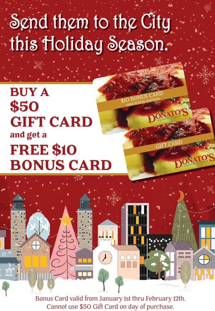 A: Yes. Donato’s gift cards are available both online and in the restaurant. They make wonderful gifts for birthdays, holidays, thank-you gestures, or simply to share the joy of authentic Italian dining with someone you care about. Buy a gift card now!