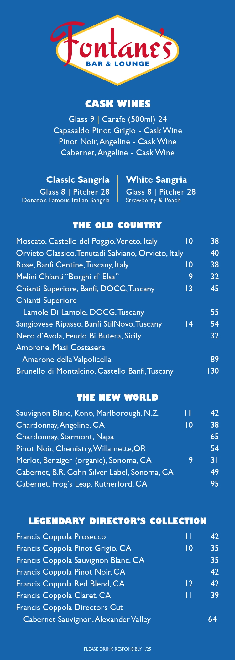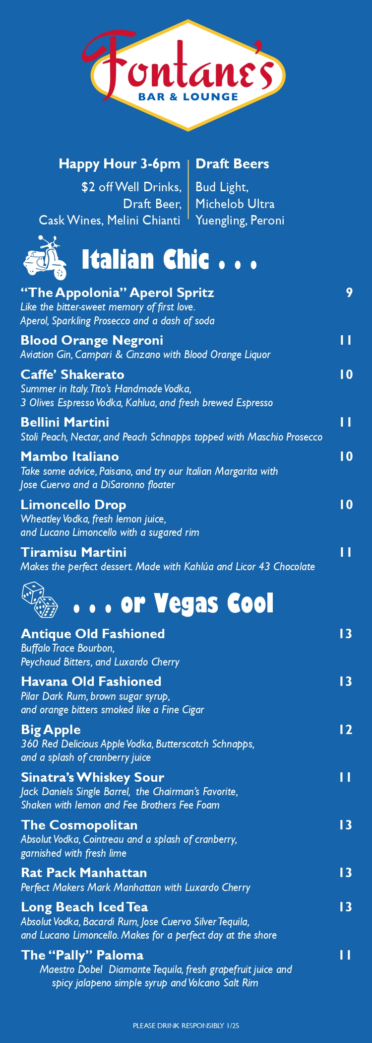 Fontane's Bar & Lounge ENJOY A COCKTAIL AND MORE AT FONTANE'S BAR & LOUNGE Relax, enjoy a cocktail, snack on one of our delicious Charcuterie Boards, or have a full meal in our relaxing bar & lounge.